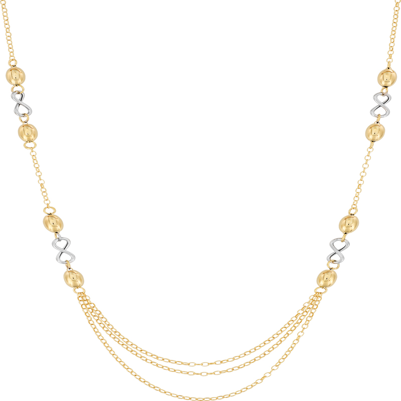 14k yellow gold cable with white gold infinity and yellow gold high polished beads